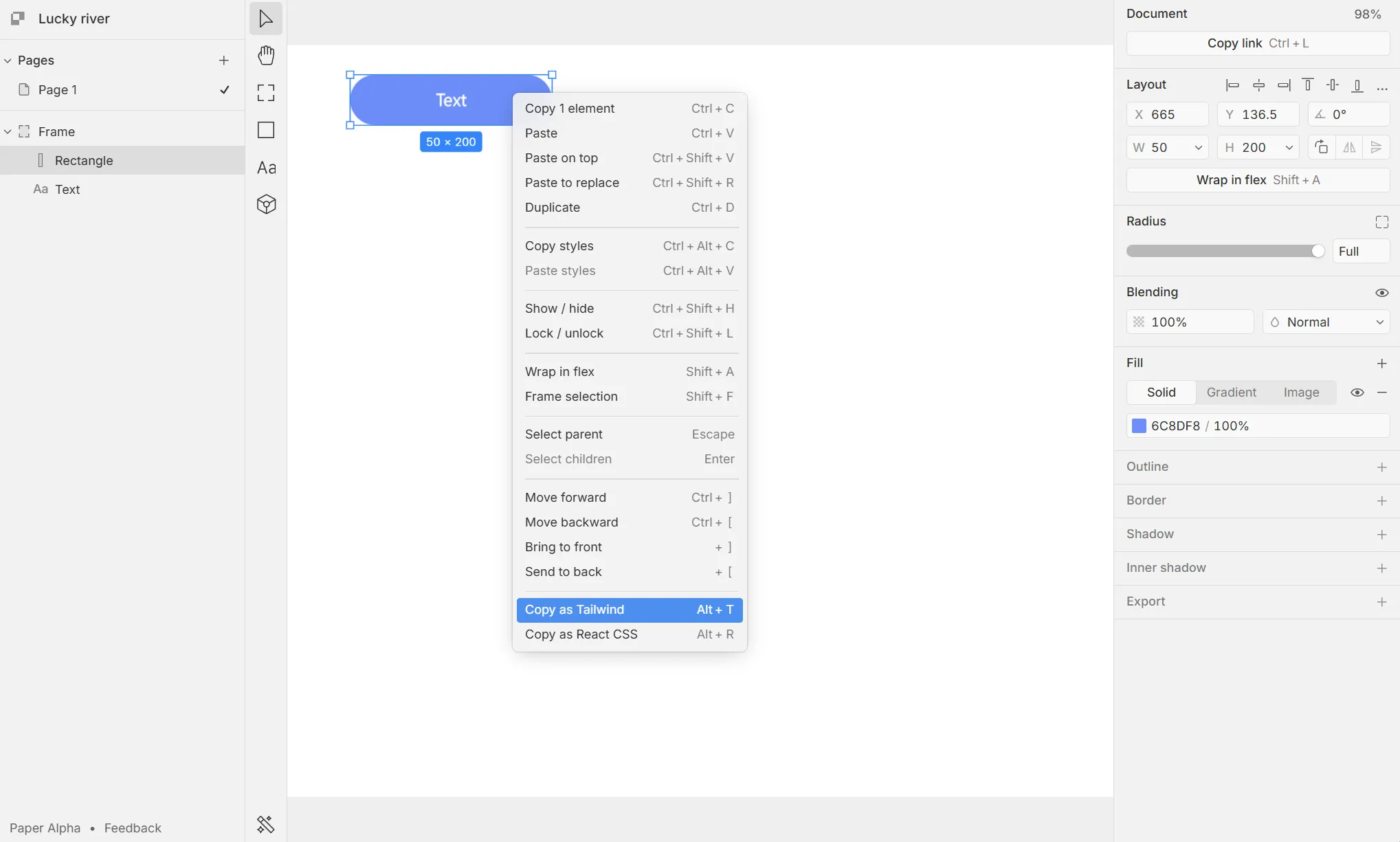 - Copy as Tailwind: One of the standout features is the ability to export styling directly as Tailwind CSS classes. This reduces the friction between "handing off" a design and actually building it.